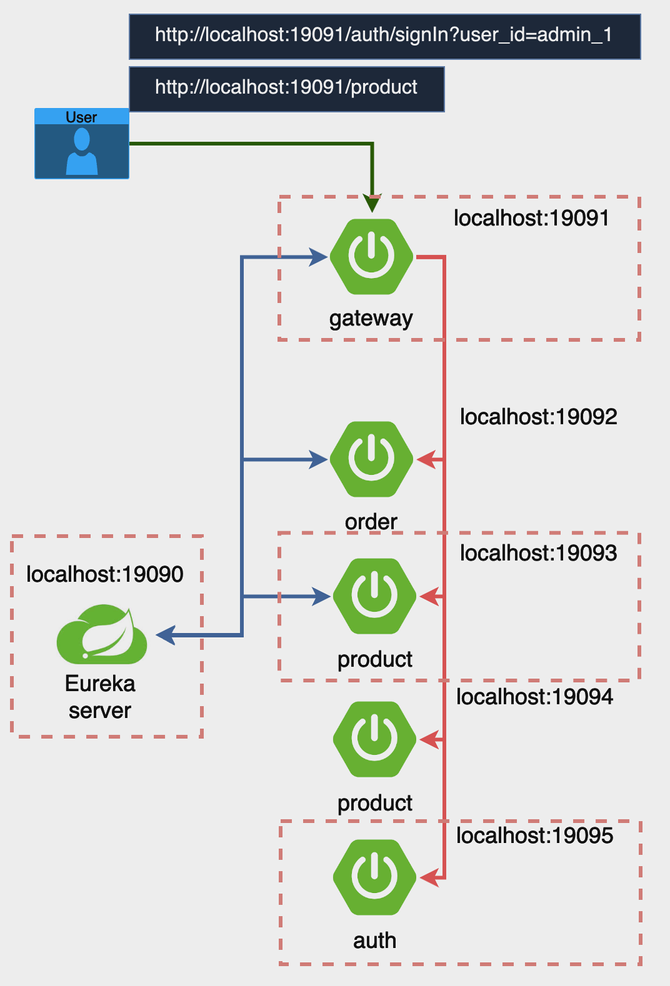 유레카 서버 ⇒ 게이트웨이⇒ 인증 ⇒ 상품 순으로 어플리케이션을 실행한다.