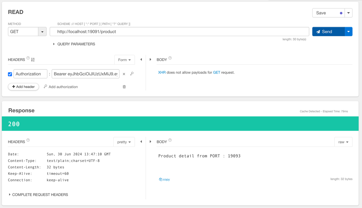 게이트웨이에 로그인을 요청하여 토큰을 발급 받은 뒤 헤더에 넣어 요청하면 정상적으로 응답이 오는 것을 볼 수 있다.