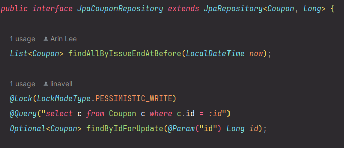 처음에는 CouponRepository 인터페이스에 비관적 락을 설정해 보았으나, 적용되지 않았다.