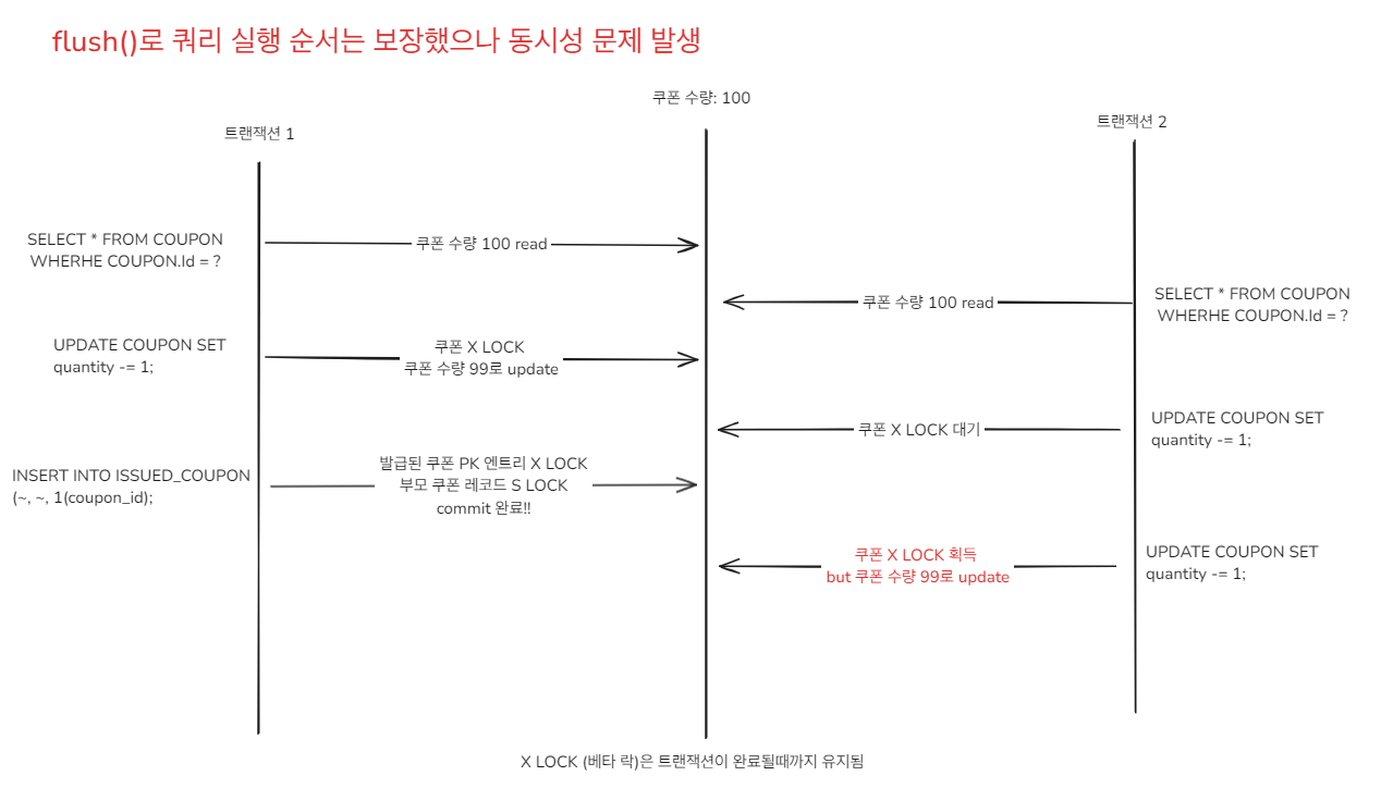 `flush()`를 적용하여 트랜잭션 실행 순서는 보장했지만 동시성 문제가 발생한다.