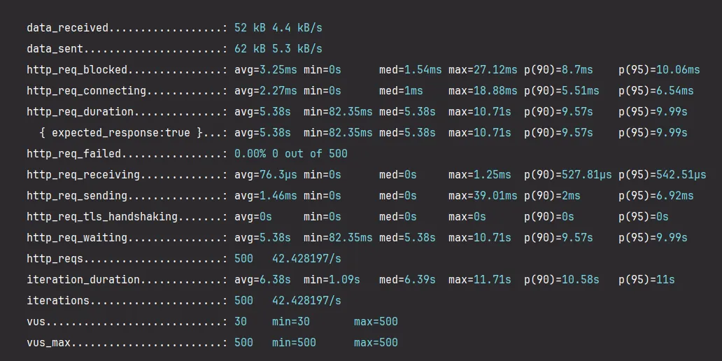 - 하지만 응답 시간(http_req_duration)은 크게 증가했다.