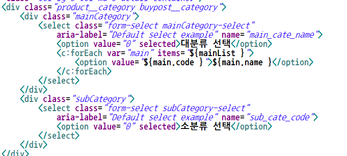 대분류 선택 selectbox 는 controller 를 통해 db에 있는 대분류 목록을 가져와서 넣어주었다.
