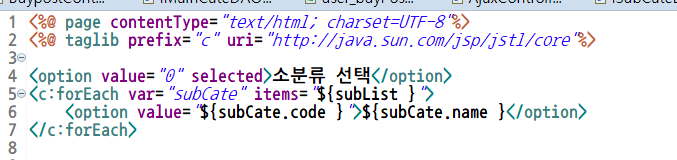 대분류 카테고리의 코드를 얻어와 그에 해당하는 소분류 카테고리 목록을 ajax.jsp 페이지에 반환한다.