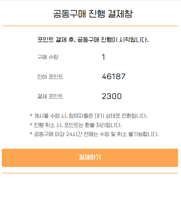 빨리 포인트쪽 오류를 수정하고 공동구매 게시물 참여 코드로 넘어가야겠다.