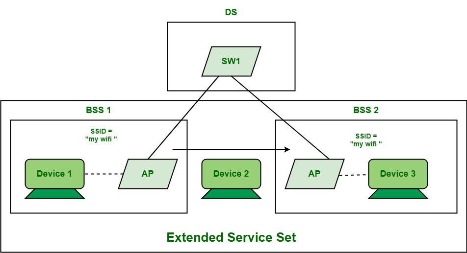 - 하나의 AP로만 구축, 이동하며 네트워크 접속 불가능