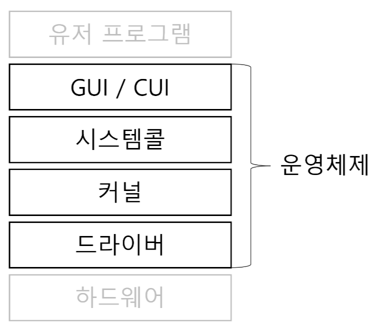 여기서 `GUI`, `시스템콜`, `커널`, `드라이버`가 운영체제