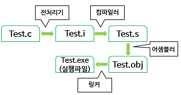 `어셈블러` 어셈블리어는 obj 코드로 변환, 운영체제마다 확장자가 다름