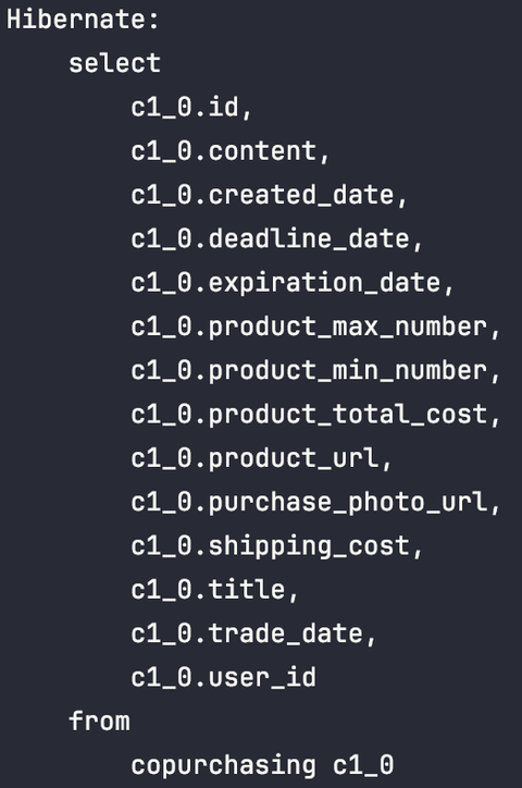 그러나 LAZY 로딩과 동일한 쿼리가 발생했고, 각 공동구매 객체에 대한 user select 쿼리가 처음 한 번에 발생한다는 차이점만 존재했다.