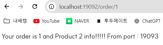 http://localhost:19090/order/1 에 접속할때마다 텍스트의 포트가 변경되는 것을 보아 요청마다 라운드 로빈 방식으로 로드밸런싱이 이루어지는 것을 확인할 수 있다.