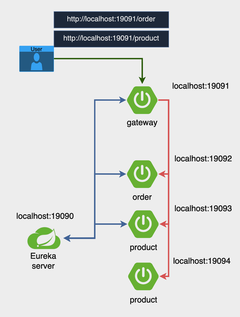 유레카 서버 ⇒ 게이트웨이 ⇒ 주문 ⇒ 상품 순으로 어플리케이션을 실행하면
